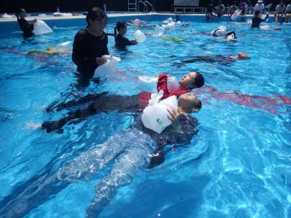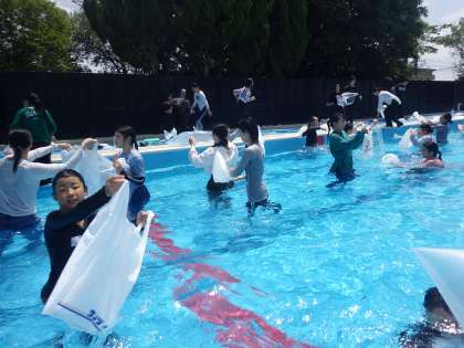 袋に空気をためると、たくさんの浮力を得ることが出来、1分以上受ける子もたくさんいました。