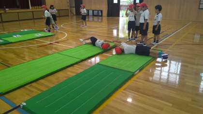 今日は前回から少しレベルアップして、いろいろな場をつくって学習をしました。友だちと手をつないで丸太ころがりをしたり、坂道を使って前ころがりをしたり・・・自分のしたい活動を見つけながらいろいろな転がり方を試していました。