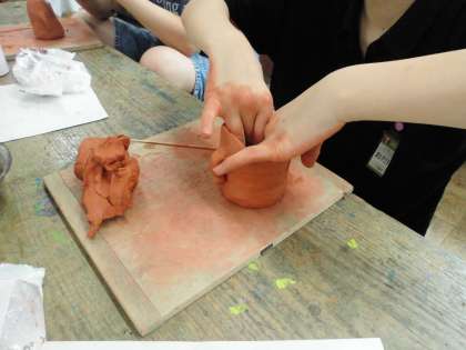 土粘土をひも状にして積み上げて作る子もいれば、粘土のかたまりにどんどんパーツを取り付ける子もいて、いろいろな方法で自分のイメージにあう作品を作り上げることが出来ました。