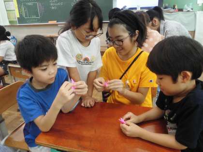 休み時間に1年生に折り鶴の折り方を教えに行ってくれています。
