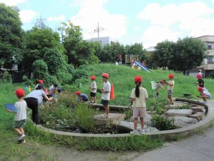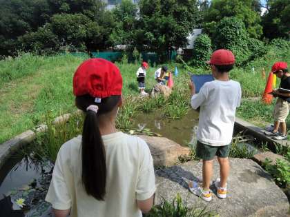 「ザリガニだ!」「ドジョウがうごいた!」と、友だちが見つけて声を上げるのを聞きながら、生き物をさがし、カメラで撮影していました。