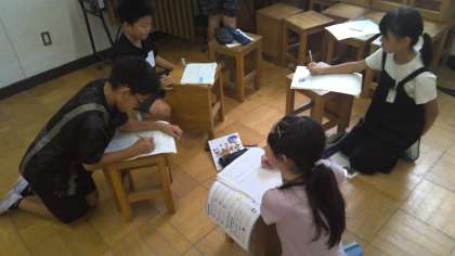 リズムアンサンブルをするためにそれぞれのリズムを選んだり、組み合わせを考えたりしています。自分のリズムをきざみながら、友だちと合わせるのに苦戦していました。でも、何度も練習を重ね上手くいったときには、グループで喜んでいました。