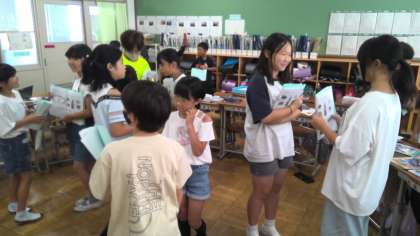 Who is this?の学習をしています。身近な人を一人選び、友だちにその人の名前や性格、できることなどを紹介し合っています。相手の紹介にリアクションを返しながらやり取りできている人もいました。