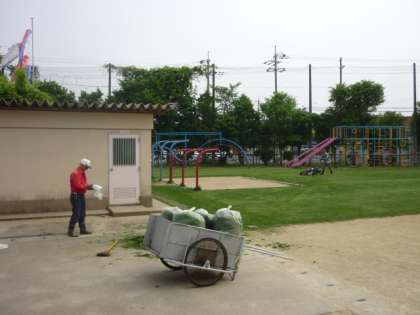 運動場の芝生はこのところの雨で伸びてきましたので,また芝刈りをしました。
