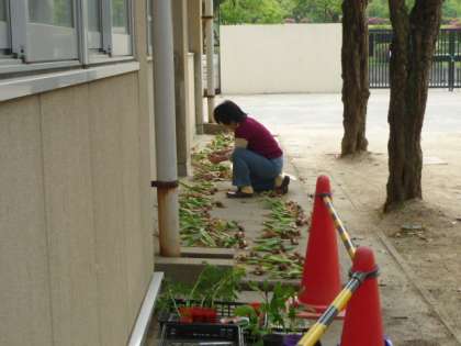 チューリップの球根やエンドウマメを採って集める等,放課後も教職員が作業をしています。