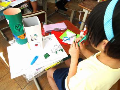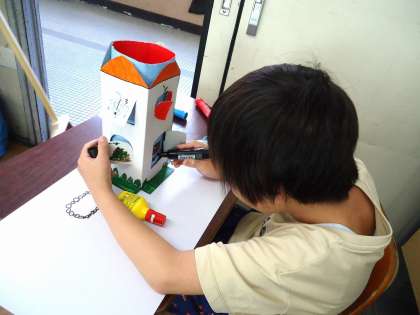 カッターナイフを使って切り開いた窓やドアの部分を開けると、内側の画用紙の絵が見えるしくみになるように、くふうしてつくっています。