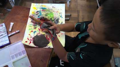 絵の具で薄く色を塗った画用紙の上に、手やゆびを使って、こいめの絵の具で塗りました。