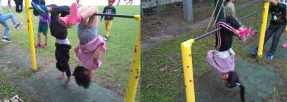 体育で鉄棒遊びを頑張っています。休み時間に、「お手本を見せて」と言うと、良くない例も含めて張り切って見せてくれました。