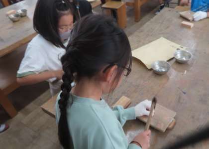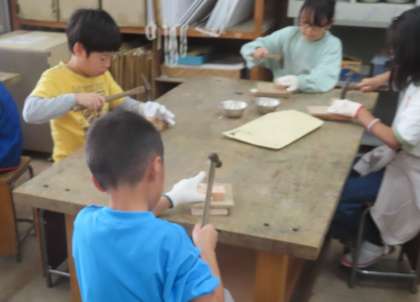図工では、金づちで釘を打つことにチャレンジ。初めて、金づちを持つ子も多く、ドキドキしながら打ちつけていました。