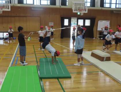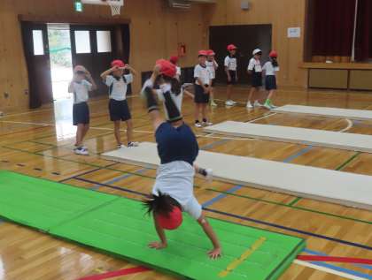 体育ではマット運動にチャレンジ。昨年までのマット遊びとは違い、それぞれが挑戦した技をしっかりともって、ねらいにあった場で一生懸命に練習しています。