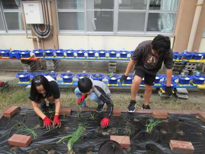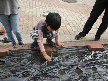2年生がものさしで測って植えていました。