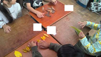 落ち葉の形を活かして、鳥や魚に見立てている子もいました。
