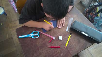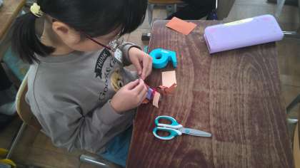 「パタパタストロー」の飾りつけをしています。画用紙を使って、しくみにあう飾りをつけました。「カブトムシ!見て!」や「手、振ってるねん!」など、感想を伝え合いながら楽しく作っていました。子どもたちは、持って帰って早くおうちの方に見せたいようです。