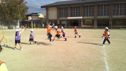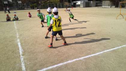 チームで声をかけながら「パスゲーム」を楽しんでいます。素早いパスもできるようになってきました。「勝ち」だけにこだわらず、チームで協力して「楽しむ」ことも頑張ってほしいと思います。
