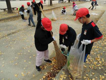 その体験として、総合的な学習の時間に3年生みんなで上桂公園の落ち葉拾いに行きました。