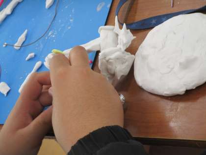骨組みを針金で作り、紙粘土をつけてロボットを形作っています。