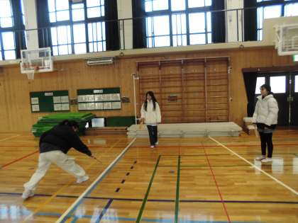 体育館では、羽子板やコマ回し、メンコなどをして遊びました。