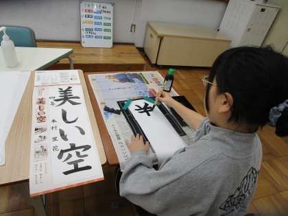 モニターに映る動画の前で筆を動かして、筆づかいのイメージをもって臨みました。