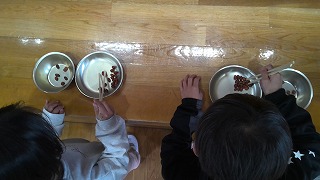 なかなか豆がつかめず、50秒間真剣な顔でお皿に移していました。