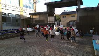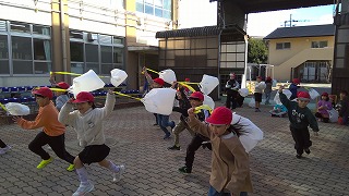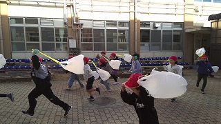冬の風を感じながら、ふわふわと飛ぶ袋を追いかけたり、たこを揚げたりして楽しみました。また次の時間も楽しいおもちゃを作りたいですね。