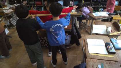 100cmをこえる長さの学習では、両手広げた長さがどれくらいかを予想し、測りました。