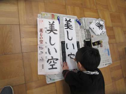 4年生は「画仙紙」を使って4文字の課題に取り組みました。