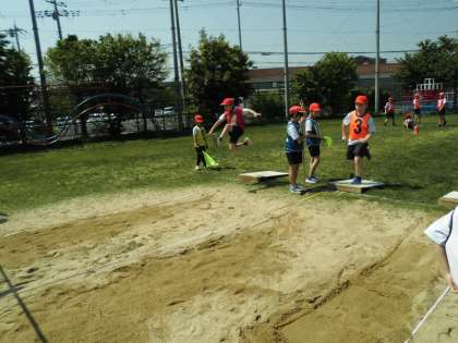 助走・ふみ切り・空中動作・着地の4つのポイントに気をつけながら、自分の記録に挑戦しています。
