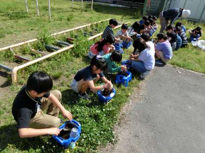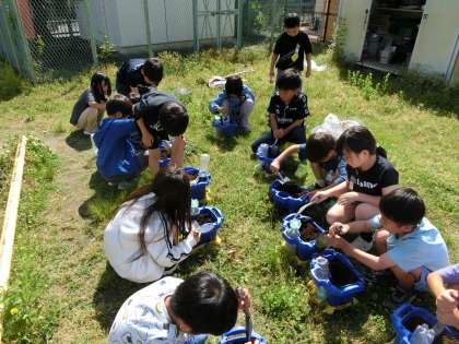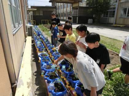 生活科で育てたい野菜を出し合い、今植えて育てられる野菜の中から育てたいものを選びました。まずは、多くの子が育てたいと言ったミニトマトを一人1苗ずつ育てることにしました。土づくりをして苗を植えました。植えた後に「大きくなってね。」「名前は、ミニミニちゃんにしようかな。」「おいしい実がたくさんとれてほしい。」など話す子どもたちの姿がありました。