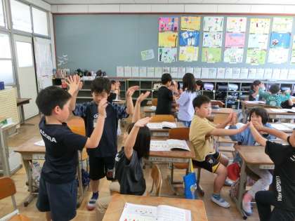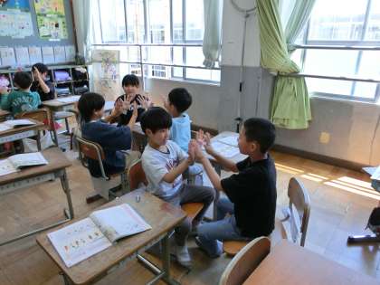 「はしのうえで」の曲で「2びょうし」のはくを感じて手遊びをしました。一人で、二人で、班でと、楽しく取り組みました。一人ではなかなかとり組みにくかった子も、グループになるとにこやかに一緒に楽しめていて、友達同士の力はすてきだなと感じました。はくに乗ってリレーをしたり手遊びしたりと、進んで活動しました。