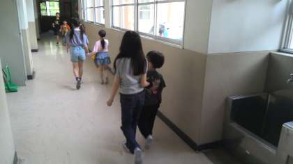 今日は6年生が1年生に職員室の入り方や、特別教室のことを教えました。