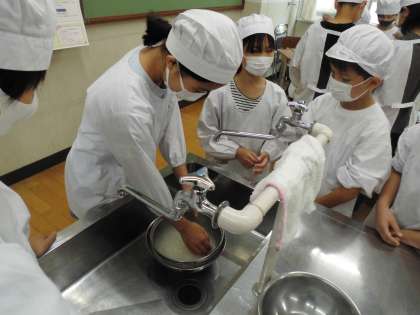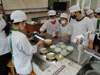 山の家での野外炊事に向けて、家庭科の学習でごはんをたきました。水や火加減に気をつけながらグループで協力して実習を行いました。炊き立てのごはんでおにぎりを作って食べました。うまくたけて子どもたちは大喜びでした。
