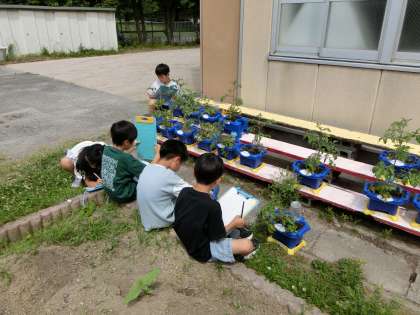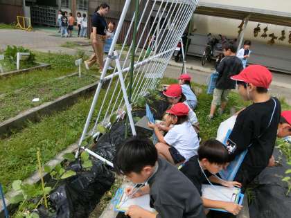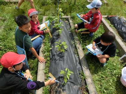 国語科で観察記録文を書きました。書く前に書きたいものを決めて、それを観察しに行きました。観察ポイントを観察し、メモしました。自分たちが育てている野菜を嬉しそうに観察していました。