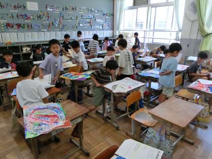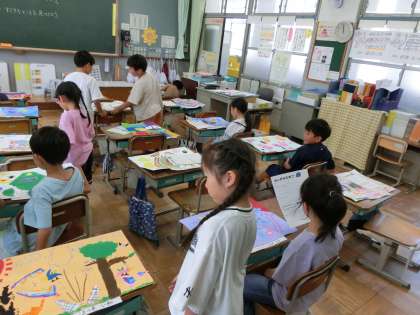 図画工作科で「ふしぎなたまご」を想像してかき、何が生まれるかとび出すかも楽しく想像を膨らませて描きました。楽しく描いた絵を鑑賞しました。それぞれのたまごの世界を味わいながら見合いました。