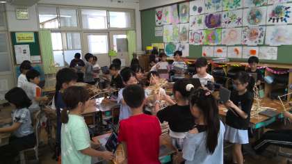 図工では割りばしと輪ゴムとつかって「つなぐんぐん」に挑戦しました。