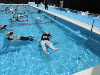 そして、授業を通して『浮いてまて』の言葉をもとに、ペットボトルや袋を使って5分以上受けるように練習をおこないました。