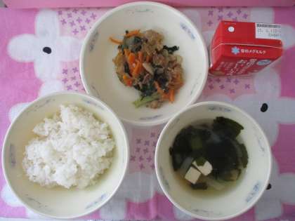 今日の献立は、ごはん、豚肉のチャプチェ、わかめスープ、牛乳でした。