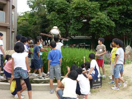 保護者の方に作っていただいた「かかし」をひょうたん池に設置しました。