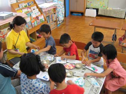 一番はじめは、新聞紙を切ってのりではって乾かし、次に白い和紙を切ってのりではってから乾かし、最後は、前にしたおりぞめを切ってのりではって乾かしました。