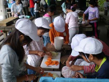 今日の夕食は野外炊事です。メニューは「鶏すきやき風煮」です。野菜を切る係、肉を切る係、かまどで薪を燃やす係・・・、グループでそれぞれ役割を決めて取り組みました。この活動から、学区の少年補導委員会や女性会の方々にボランティアとして応援していただいています。