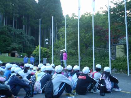 山の家の2日目が始まりました。夜はしっかりと睡眠をとり、子供たちの目はパッチリです。今朝は、一緒に宿泊している3つの小学校、朝の集いで交流し、互いの学校の紹介を行いました。