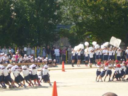 本校運動会の特色のひとつ,きょうだい学年種目です。異学年の児童が力を合わせてがんばります。一生懸命つなを引いている1年生を,後から追いかけてきた4年生が加勢します。1年生にとって,とても頼もしい4年生です。