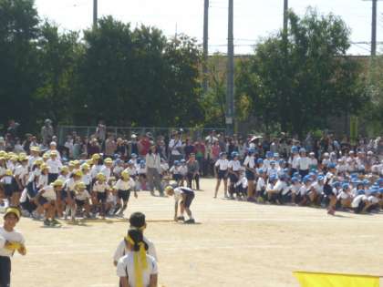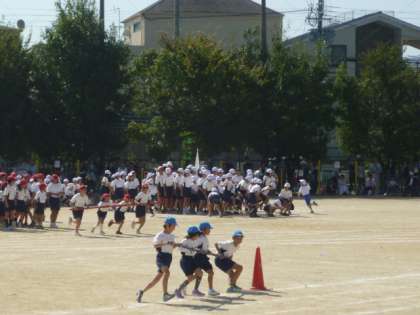 2年生と5年生がぴったり息を合わせることができるかが勝敗の分かれ目です。長い棒を操作したり,跳んだり,しゃがんだり,ちょっと気を許すとなかなかうまくいきません。