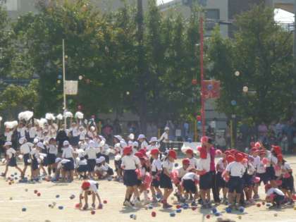 かわいいダンスを踊った後,いよいよ玉入れです。1年生にとって意外とむずかしい玉入れ。たくさん入るかな?