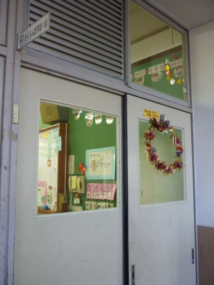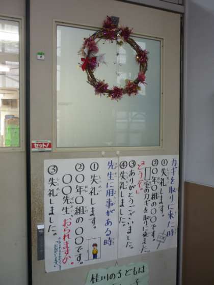 先日の「桂ふれあいプラザ」で購入した「クリスマスリース」(桂中学校育成学級生徒:作)を職員室とさくらんぼ学級の教室に飾っています。