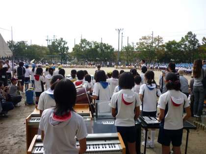 15分遅れで開始いたしました。ミュージックサークルの児童の演奏のもと,先頭の青組が元気に入場してきました。