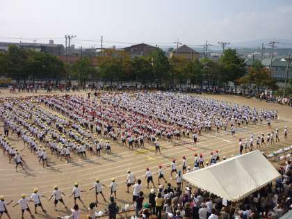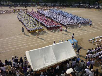朝の雨が信じられないくらいの天気となりました。今年は,青,黄,赤,白の帽子が揃い,壮観です。開会式の後,軽快なリズムに乗って準備運動をしました。
