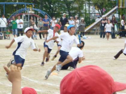 さすが高学年のリレー。迫力満点です。バトンパスの仕方で順位が入れ替わります。
