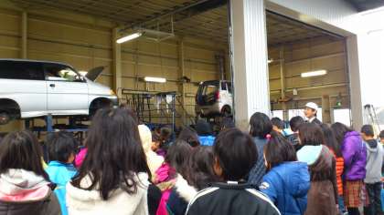 リサイクルセンターでは,部品をとる前処理の様子,車体をプレスしてかたまりにする様子などを見ました。