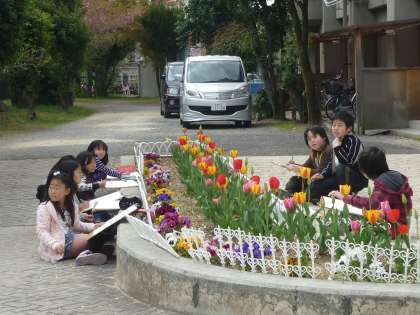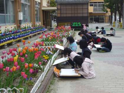 5年生の始めての図工の時間は,花と校舎の様子をについて話し合い,描き表したいイメージを考えて花壇の所で下絵を描きました。