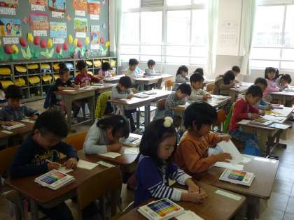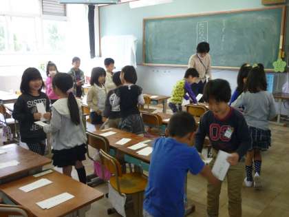 自分の名前を書いた名刺を作り,名刺交換の練習です。